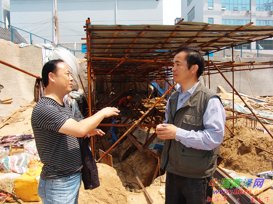 王潇潇(左)和菏泽考古工作人员商讨沉船吊装方案