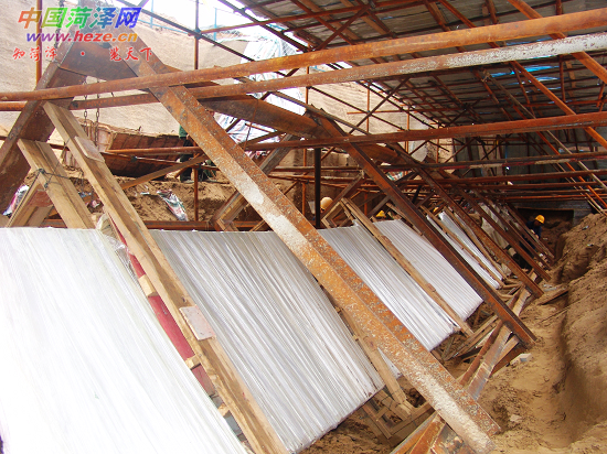 记者在现场看到,固定沉船的八个钢结构连接架已调整到位,在连接架与船底之间的空隙内已塞入了木制三角板。“加装三角板,可将船底固定,又可防止船底与连接架直接接触,以免起船时对船底造成损害。”牡丹区文物管理所副研究馆员、发掘现场业务指导孙明说。