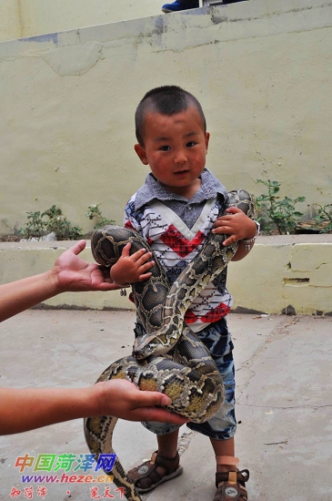 昨日上午,菏泽儿童公园的两栖动物馆前,一个两三岁的小男孩用手轻抚着一条七八公斤重的蟒蛇,一会儿尝试着把它抱起,一会儿又托起它的头嬉戏……