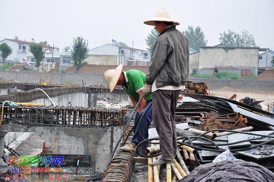 中国菏泽网消息 (记者 艾慧丽) 昨日,雨下个不停,而在菏泽赵王河大学路桥和人民路桥工地,施工人员仍头戴草帽坚持施工。