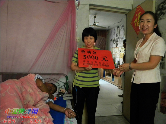 由本报与市慈善总会、菏泽移动公司联合开展的“周行一善”活动将孔庆和列为救助对象,8月29日上午,市慈善总会副会长、市民政局副局长王爱华来到孔伟家中,将5000元救助金送到孔庆和手中。王爱华对孔庆和说:“市领导非常关心你的病情,专门嘱咐我向你表示慰问,希望你安心养病,有困难我们一定会尽力帮你解决。”手持5000元救助金,躺在病床上的孔庆和激动地流着泪说:“谢谢政府和领导对我的关心,谢谢帮助我们的所有好心人。”