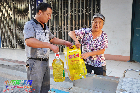 中秋节快要到了,菏泽开发区丹阳办事处都庄社区65岁的岳桂荣老人,高兴地领到了社区发放的大米和大豆油。