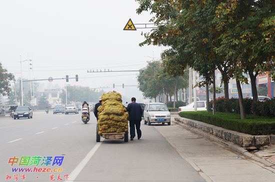 中国菏泽网消息 (记者 张圆圆)11月4日上午,在市和平路非机动车道上,记者见到了来自枣庄的张先生,他正赶着租来的毛驴车,沿街叫卖芋头。