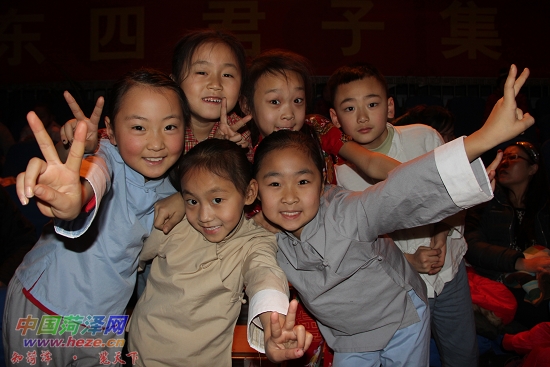 “我叫马文雅,今年六岁了。”“我今年九岁了,我是陈雨彤。”“我是朱怡宁,今年七岁了。”昨日下午,表演完《菏泽大变化》节目后,听说记者要采访时,三位“老太太”争相自我介绍。她们挽起头发,穿上偏襟,俨然一个个“小老太太”。“阿姨,你瞧瞧我的皱纹,跟老奶奶的皱纹一模一样呢!”马文雅指着自己额头上的“皱纹”对记者说。“我也有‘皱纹’呢。”陈雨彤不甘落后。看得出来,她们对“老太太”这一角色很是喜欢。