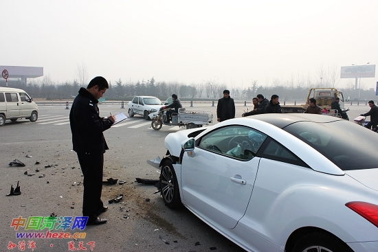 昨日11时许,市人民路与牡丹北路交叉路口发生一起交通事故。一辆跑车与一辆私家车相撞,跑车前部“面目全非”,私家车右侧面凹了进去。一位目击者说,事故可能是闯红灯引起的。交警正在对这起事故进行调查处理。