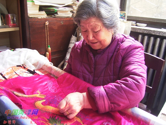 在桑玉琴的家里,记者见到81岁的她正在绣龙。她5岁跟姑姑学习曹州绣活,6岁就会绣花。长大后成了一名人民教师,退休后上了老年大学,学会了画画,自己绣自己画的作品,其乐融融。她把鲁绣与苏绣相结合,在继承上创新。其绣的迎客松、八骏图、十二钗图等作品栩栩如生。