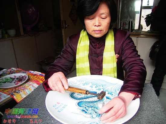 见到马宪荣时,她正在家里刻瓷。她说,从事刻瓷已经近40个年头了,春节过后,她精心创作了“蛟龙出海”和“龙驾祥云”两件作品,祝福全市“两会”的胜利召开,并寓意菏泽发扬龙的精神,使社会繁荣、稳定与和谐。