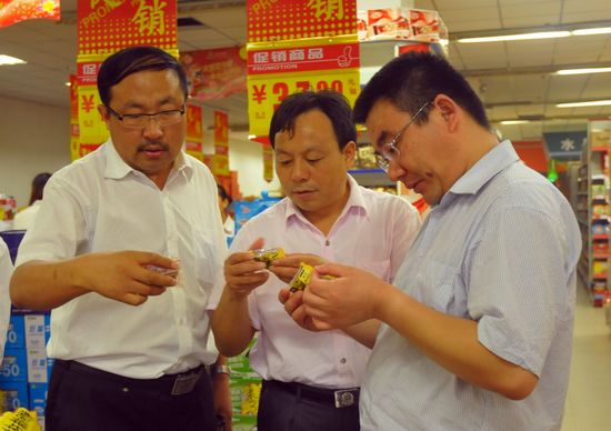 市商务局副局长孙雷(中),郓城县副县长王明华(右)参观郓州百货超市。