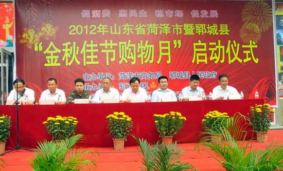 为进一步扩大消费需求、挖掘消费热点、引导消费潮流、营造消费氛围。9月23日上午,2012菏泽市暨郓城县“金秋佳节购物月”活动启动仪式在郓城唐塔商场广场隆重举行。市商务局副局长孙雷,郓城县副县长王明华出席启动仪式。
