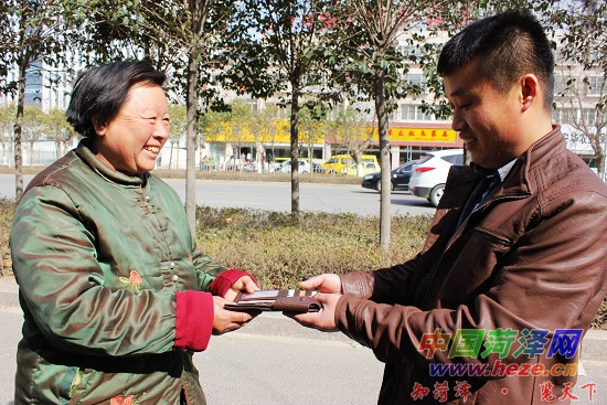 建国)昨日上午10时许,市八一路与华英路交叉口附近。“我真没想到钱包还能找到,你还给我送过来了,你真是‘活雷锋’。”接过失而复得的钱包,市民马先生感激地说。“这都是应该做的,没啥,以后一定要看好你的钱包。”菏泽开发区丹阳办事处桑海社区55岁的郑秀兰憨厚地说。