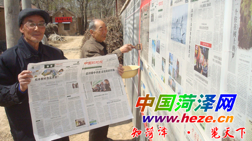 “看了赵健大爷办的环保专栏,我不再燃烧从田里收回的地膜了。”近日,“环保专栏”读者王新旭说。几年来,单县终兴镇西程六村退休教师赵健(左一)在本村沿街办起读报专栏,张贴自费订阅的环保报刊。目前,赵健老人已“出版”了421期环保专栏,并在每期配发“编者按”,引导群众阅读与思考,提高了群众的环保意识受到大众欢迎。 通讯员 刘厚珉 摄