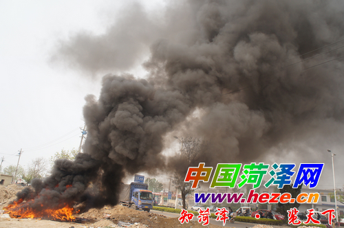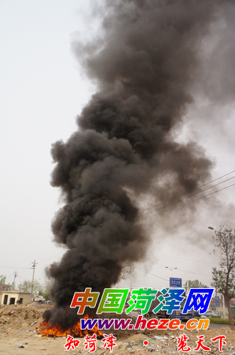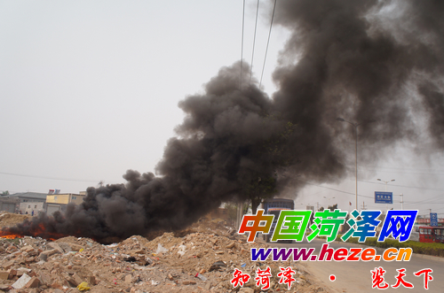中国菏泽网消息 (记者 张圆圆 陈敏)昨日9时许,菏泽市交警支队市区大队对面一处已拆迁的待建地块,突然冒出十几米高的黑色浓烟。记者赶到现场看到,该地块内到处都是建筑垃圾,还散落着许多海绵垫碎块、泡沫等工业垃圾。现场浓烟滚滚,高达十几米。空气中弥漫着烧焦的刺鼻气味,马路对面甚至都能闻到。附近一位居民告诉记者,经常有人往该处倾倒垃圾,焚烧垃圾的事也时有发生。