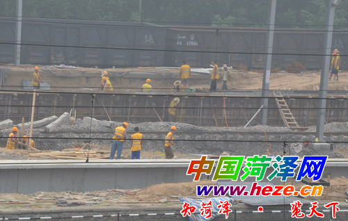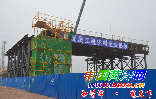7月15日,菏泽火车站旅客进站天桥正在紧张建设中。时值盛夏,菏泽火车站改造工程现场依然热火朝天。目前,旅客进站天桥的6个钢结构支柱已经安装完毕,3号和4号站台改造正在进行,预计9月底投入使用。老站房拆除后的建筑废料已清理完毕,新站房正在进行地基施工。记者 解中卫 摄