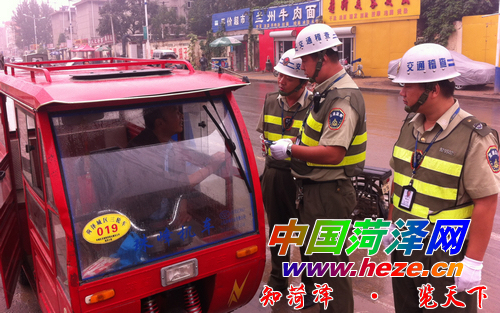 9月9日,参与城区交通秩序综合整治的巨野县交通运输局执法人员在火车站冒雨检查三轮车。据悉,自9月1日菏泽城区交通秩序综合联合执法开始以来,执法人员已查扣非法营运电动三轮车34辆、自制篷电动三轮车27辆、面包车6辆、“电轿”1辆,有力地震慑了非法营运行为,畅通了城区交通秩序。 记者 刘兰英 摄