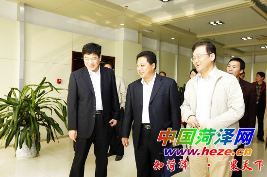 图为菏泽日报社党委书记、社长常健(中)与市煤炭管理局负责人(右)、山东新巨龙能源有限责任公司领导(左)在安全生产监控室听取解说