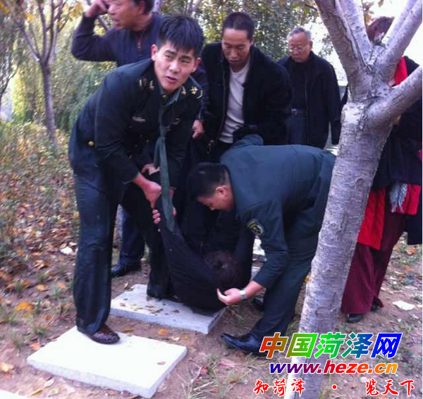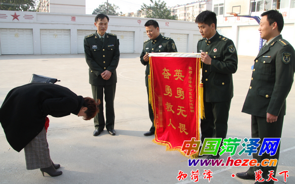 “多亏你们,要不她就没命了……”11月19日,在菏泽军分区院内,市民刘女士握着勤务队战士洪田朝和王伟的手不住地鞠躬,同时送上一面写有“英勇无畏,奋勇救人”的锦旗。
