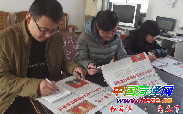 11月15日,定陶县马集镇干部王彪(左一)、潘长琳(左二)等正在学习《菏泽日报》刊登的十八届三中全会公报,写心得笔记。 据悉,党的十八届三中全会闭幕后,马集镇掀起了学习全会公报高潮,镇党委政府采取周一、周三、周五集中学习和个人自学相结合,并要求学习后写出心得笔记,把会议精神落实到实际工作中去。通讯员 刘忠玉 记者 刘卫国 摄