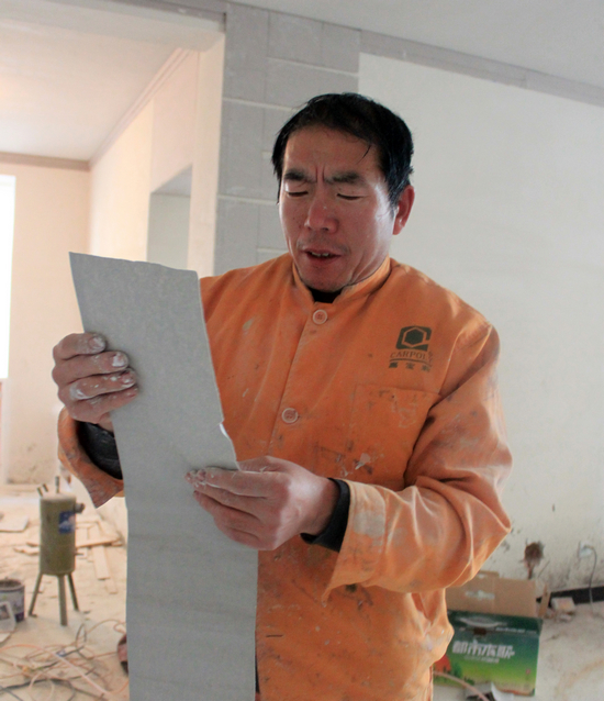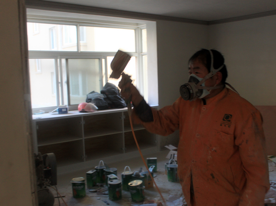 戴着防尘面具,身上和脸上沾满了油漆……记者昨日见到杜修运时,他正在为一户新装修业主家的壁橱喷漆,新房内充斥着刺鼻的油漆味,让记者有些受不了。