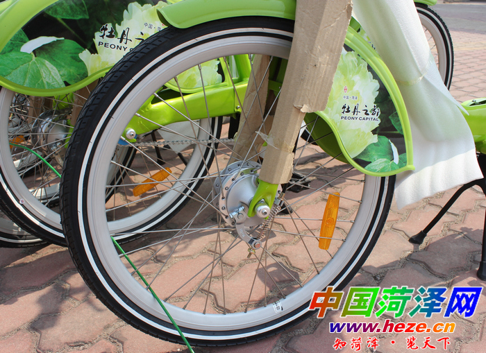 这批公共自行车有两种颜色:宝石蓝和苹果绿。车辆前后轮的护罩上印有大朵牡丹图案和“中国牡丹之都”字样,体现了菏泽的牡丹文化特色。车篓与车身连为一体,不可拆卸,“最大负重为5公斤”。车座正下方有一个开关,可根据骑者需要调整车座高度。车身前后都有反光标,可提高夜间骑行的安全性。右侧车把处还有一个设计独特的圆形车铃。