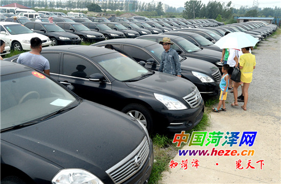 7月20日,市民在山东枣庄一家拍卖公司场地上查看待拍公车。当日,标有序号的103辆公车整齐地停放在山东枣庄一处拍卖公司场地上,许多市民冒着酷暑前来查看。山东省枣庄市党政机关的103辆公务用车将于7月23日至25日在中国拍卖行业协会网络平台的5个大厅进行公开拍卖,如此大规模的政府公车拍卖在山东属首次。自2013年底,枣庄市启动了公车清理整顿工作,251个市直部门及各级党政、人大、政协、法院、检察院等领域全面开展自查自纠行动。目前,通过公开招标方式,中标评估机构已经对部分被清理的公车进行了价格评估。据悉,枣庄启动的网上公车拍卖,收入全部上缴国库。 新华社记者 冯杰 摄