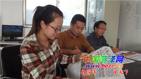 10月25日,定陶县马集镇干部牛娟丽(左一)、胡志昊(左二)等正在学习十八届四中全会公报,写心得笔记。据悉,党的十八届四中全会闭幕后,马集镇迅速掀起了学习全会精神高潮,镇党委政府采取周一、周三、周五集中学习和个人自学相结合,并要求学习后写出心得笔记,把会议精神落实到实际工作中去。 通讯员 刘忠玉 记者 刘卫国 摄