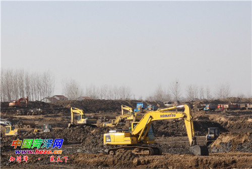 菏泽市洙赵新河治理工程是省级水利工程,东明县施工段位于河道下游与济宁市交界处,全长2154米、积水深2至3米、淤泥平均厚约3米,属全市工程“难工段”。在积水多,无弃土场等困难条件下,东明县精心组织,科学安排,集思广益,竭尽全力打好攻坚战。截至目前,共排出明、暗积水40余万方,开挖鱼翅沟100余条,铺设马道110道,修筑堤坝1000余米,动用土方45万方,开挖主河槽土方76余万方,占总土方量的90%。图为机械施工现场。