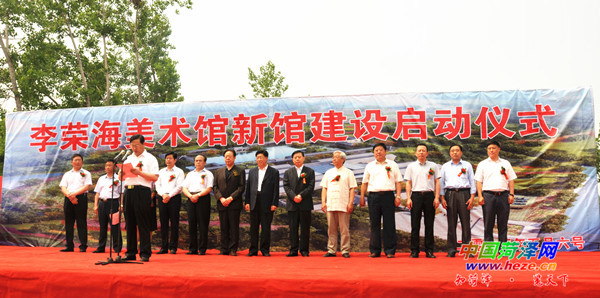 陈常召)5月6日,李荣海美术馆新馆建设启动仪式在中国牡丹园举行,山东省人大科教文卫委主任王文升,中国书协副主席张业法,菏泽市委常委、宣传部长王永江,菏泽市人大常委会副主任丁志刚,菏泽市副市长、牡丹区委书记刘传谨出席启动仪式。