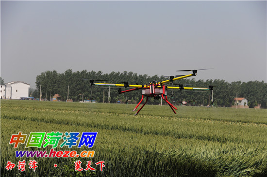5月13日,在在成武县伯乐集镇实施无人飞机小麦“一喷三防”作业。为确保小麦丰收高产,成武县以小麦“一喷三防”专业化统防为抓手,不断提升植保社会化服务水平,全县专业化防治组织机动药械6500余部,其中无人飞机喷雾剂、自走式喷杆喷雾机、拖拉式喷杆喷雾机等大型喷雾机25余台,骨干人员1000余人,日作业能力达10万亩以上。记者 王浩 摄