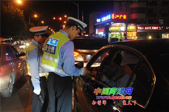 荆彦茹)5月19日晚,菏泽市交警支队市区大队在城区展开治理酒后驾驶、涉牌涉证等重点交通违法集中整治统一行动,当晚共出动警力100多人、警车20余辆,在市曹州、牡丹路周边设置部署警力,设卡严查。