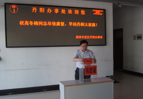 6月4日,菏泽开发区丹阳办事处开展为白血病患者高冬梅献“爱心捐款”活动。开发区管委会主任助理、丹阳办事处党委书记杨传宏,办事处党委副书记、主任朱家福带头分别捐款3000元,不到半小时,各委办、部分社区共捐款10.39万元。