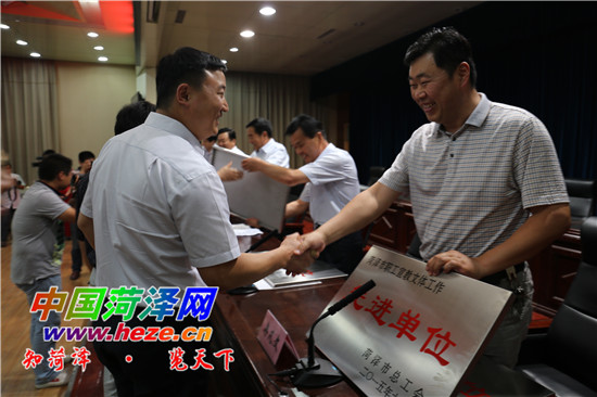 中国菏泽网消息(记者 李立) 6月17日下午,全市职工宣教文体工作总结表彰会议在市政府第四会议室召开,市总工会领导班子及机关全体人员,各县区工会分管主席、宣教部长,受表彰的先进单位和个人代表参加了会议。会议表彰了职工宣教文体工作先进单位、个人和第五届职工运动会特别贡献奖的单位。