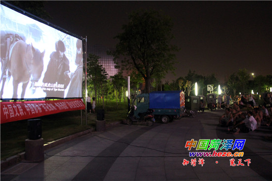 在现场,几百名市民聚集在牡丹广场,欣赏红色电影《智取威虎山》,扣人心弦的故事情节引来市民阵阵赞叹。