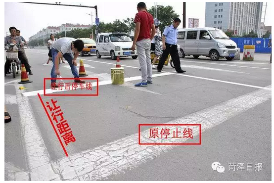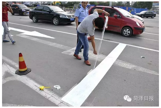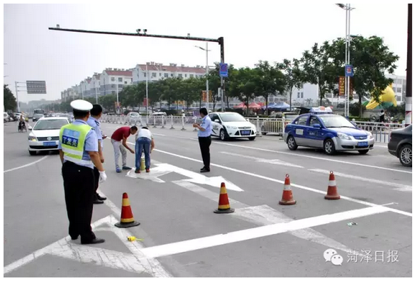下午4时20分左右,中国菏泽网记者在市长江路与和平路口附近看到,菏泽交警支队市区大队设施科工作人员正在对该路段南口标线进行调整。