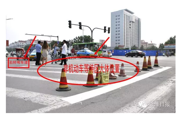 据菏泽交警支队市区大队一大队队长沈祥峰介绍:为进一步缓解市区道路拥堵,提高右转车辆通车率,菏泽城区路段将第一次尝试“非机动车等待区”前移。以长江、和平路段作为实验路段,此次将和平路南向北方向非机动车等待区前移近10米,机动车等待区后移3米,为长江路西向东方向行人及非机动车让行。“初次使用阶段,会根据路段通车情况随时进行调整。为让市民行车方便,更快地熟悉路口这一改变,我们将会安排执勤交警在此进行指挥。”沈祥峰介绍。