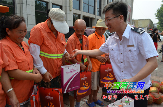 工作人员先后来到菏泽城区牡丹路、中华路主干道十字路口,将慰问品送到工作在一线的环卫工人和执勤交警手里。“城市的整洁与环卫工人的辛苦工作密不可分,他们在高温下依然坚守岗位,用汗水为城市的卫生整洁作出了贡献;交警同志们为了交通畅通和市民的安全出行,顶着烈日工作十分辛苦。开展此类公益活动尽一份微薄之力,是我们应负的社会责任,以此表达对他们的敬意和感激之情。”菏泽汽车总站常务副站长魏炜说。