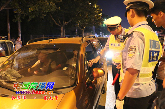 荆彦茹)8月25日晚,菏泽市交警支队市区大队交警在城区展开治理酒后驾驶、涉牌涉证等重点交通违法集中整治统一行动,当晚共出警力6个中队,在中华路与广福路、中华路与西安路、中华路和成阳路3个岔口设卡,采取设置固定点卡与机动巡逻相结合,逐一检查过往车辆。