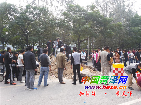 9月16日上午,在市郑州路与和八一东路交叉口北侧,一堆建筑垃圾和乱石挡住半幅道路,现场还放有绕行指示牌和防撞桶。这里是菏泽驾考科目三考试路段,当日原本有600多名学员要考试。考试路段被封,考试无法如期进行,从各地赶来的学员情绪激动,尽管现场有交警维持秩序,还是有人砸毁了防撞桶。随后,“科目三考场被封”的消息迅速在微博、微信、贴吧、论坛上传播。