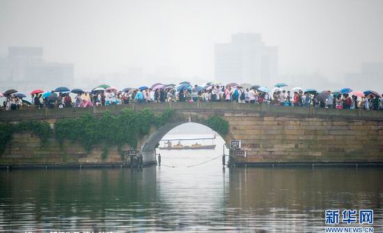 2015年10月4日,国庆长假的第四天,杭州淅沥沥的小雨让西湖比平时更多了几分朦胧,断桥上,游客撑起各色雨伞汇聚交融在一起,显得颇为壮观。图片来源:东方IC