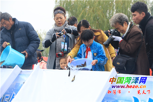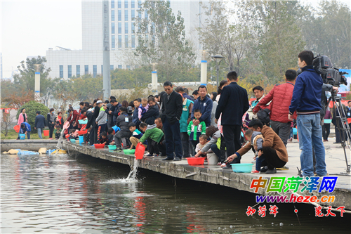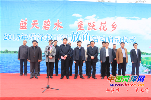 中国菏泽网消息(记者 李鲲)10月31日上午,“蓝天碧水 鱼跃花乡”2015年菏泽赵王河放鱼活动启动仪式举行。从今天开始,将有400万尾鱼陆续被投放到赵王河、雷泽湖内,旨在通过放鱼养水改善生态环境。