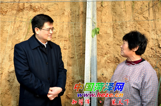 图为孙爱军在郓城县武安镇窦寺村蔬菜大棚中与农民张永花交谈,了解大棚收入情况