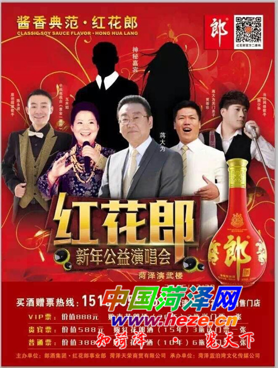 中国菏泽网消息(记者 陈常召)为贯彻落实中共十八届五中全会精神,开展教育扶贫,诠释"牡丹之都 善行天下"社会道德风尚,郎酒集团·红花郎事业部特联合菏泽天荣商贸有限公司、菏泽蓝泊湾文化传媒公司、菏泽荧星文化学校,将于12月29日在菏泽演武楼举办"红花郎大型公益演唱会"。