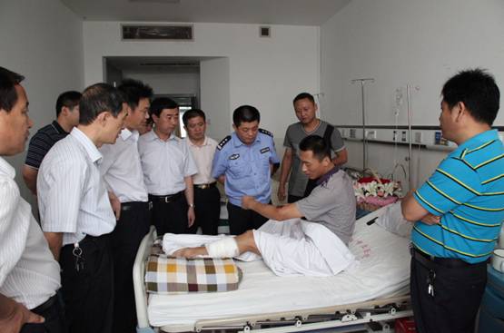 镜头一:2011年9月2日,他带领队员在抓捕飞车抢夺作案20余起的犯罪嫌疑人颜某、丁某时,为防止犯罪嫌疑人逃跑,他不顾个人安危,果断驾驶摩托车将犯罪嫌疑人摩托车撞倒,左腿被撞掉一大块肌肉,鲜血汩汩直流。但他顾不得伤痛,死死抓住犯罪嫌疑人并将其制服。一周后,伤口尚未拆线,他又投入到一起恶性强奸案的侦查中,亲手将犯罪嫌疑人李某抓获。