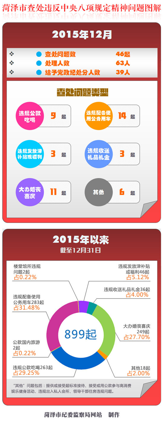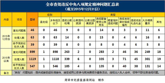 中国菏泽网消息(牡丹晚报记者 长天) 1月5日,市纪委公布2015年全市纪检监察机关查处违反中央八项规定精神问题情况,违规配备使用公车、违规公款吃喝、大办婚丧喜庆占据违规问题数量前三位。全市547人受到党政纪处分,其中包括1名县处级干部。