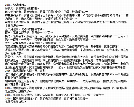 他在感谢信中写道,2016,我想跟所有人说一声,谢谢!这声谢谢不足以代表感恩,因为有太多爱集聚在霖霖、爱人和我的身上,爱需要传递与传承,一声谢谢显得渺小和不负责任。