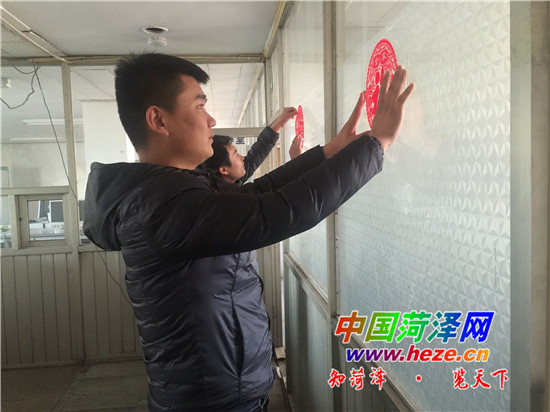 菏泽城区一单位坚守岗位的工作人员为办公室贴福字挂灯笼迎接新年