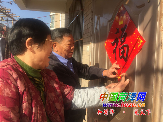 2月7日,市民杨玉坤与老伴王秀兰老人在家贴福字迎新年