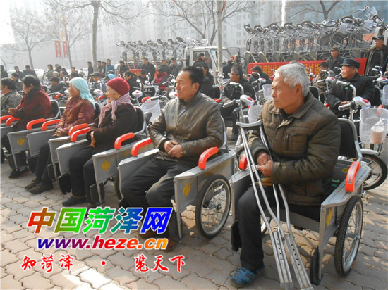 中国菏泽网消息(记者 亚伟)2月25日,由市民政局、市福彩中心联合开展的第五届“福彩扶老助行”活动发放仪式举行。活动现场,来自牡丹区、菏泽开发区、菏泽高新区的50余名“三无”(无子女、 无自理能力、无生活来源)老人成为今年的首批受益者,每人免费领取一辆电动三轮车。