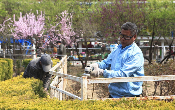 3月22日,在菏泽天香公园,工人正在对公园内的护栏进行复新处理。近日,为了给游客创造一个良好的赏花环境,天香公园对内部设施进行翻新,迎接牡丹文化旅游节的到来。