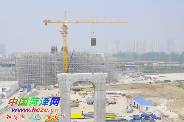 火车徐徐出站,铁路东侧,丹阳立交桥主桥箱梁和主塔同时施工,塔吊吊起加工完成的爬模模板,放置在主塔上(如图)。