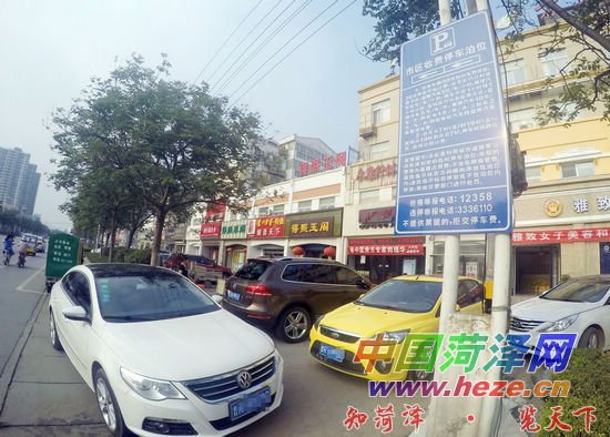 市区和平北路停车泊位收费公示牌附近,部分车辆停放在规划车位内,但也有些车辆未按规定停放。 记者 张 啸 摄